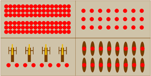 - a 6 x 8 x 2 inch box for land and naval battles. It includes dice, terrain, markers, and boards (green plains, brown desert, and blue sea boards)